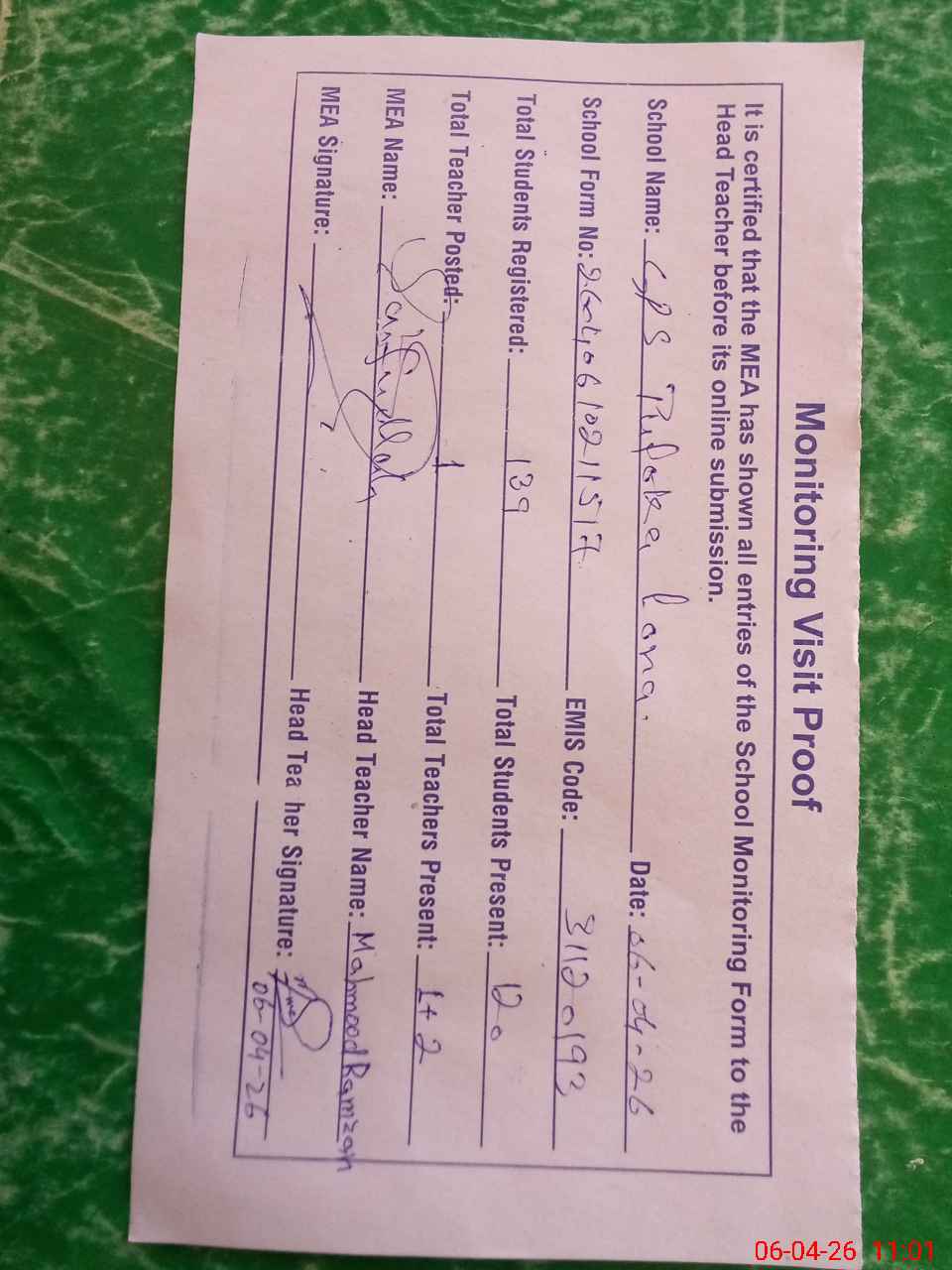 | Attendance Register | Head Teacher | MEA with School | Visit Proof |