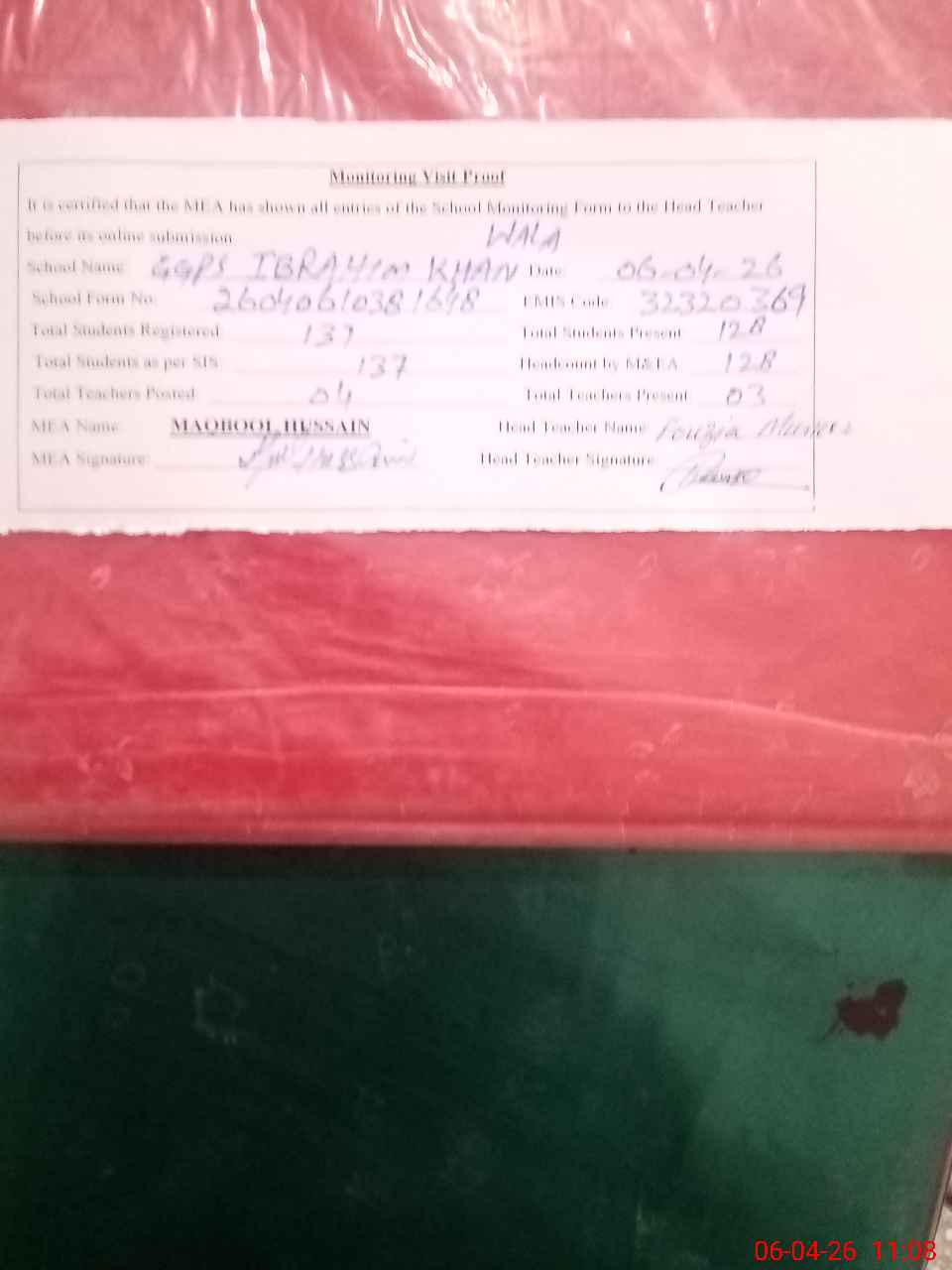 | Attendance Register | Head Teacher | MEA with School | Visit Proof |