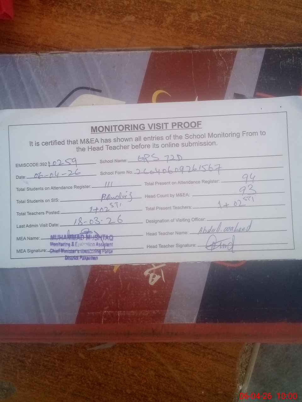 | Attendance Register | Head Teacher | MEA with School | Visit Proof |