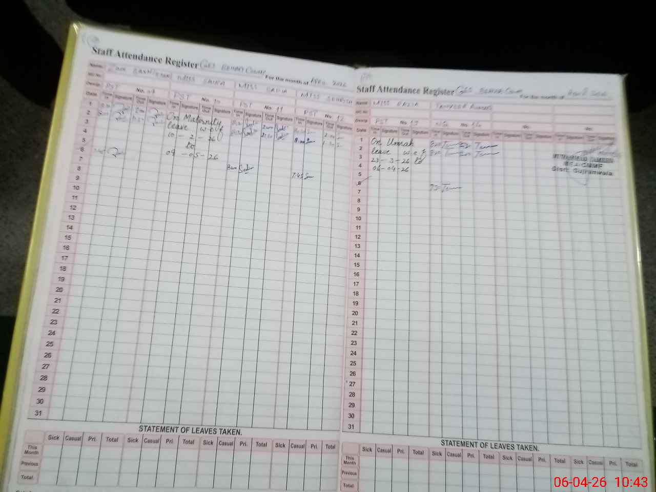 | Leave | Duty | Absent | Maternity | Medical | Ex- Pak |