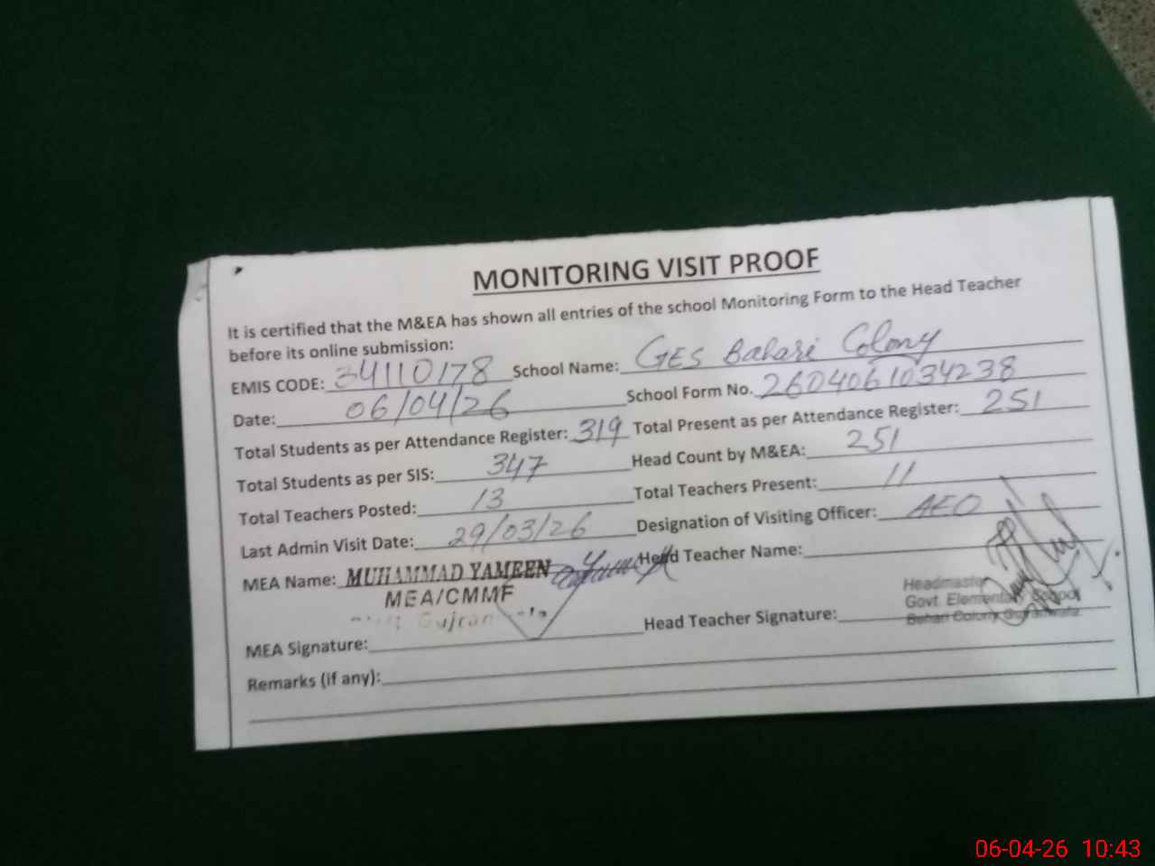 | Attendance Register | Head Teacher | MEA with School | Visit Proof |