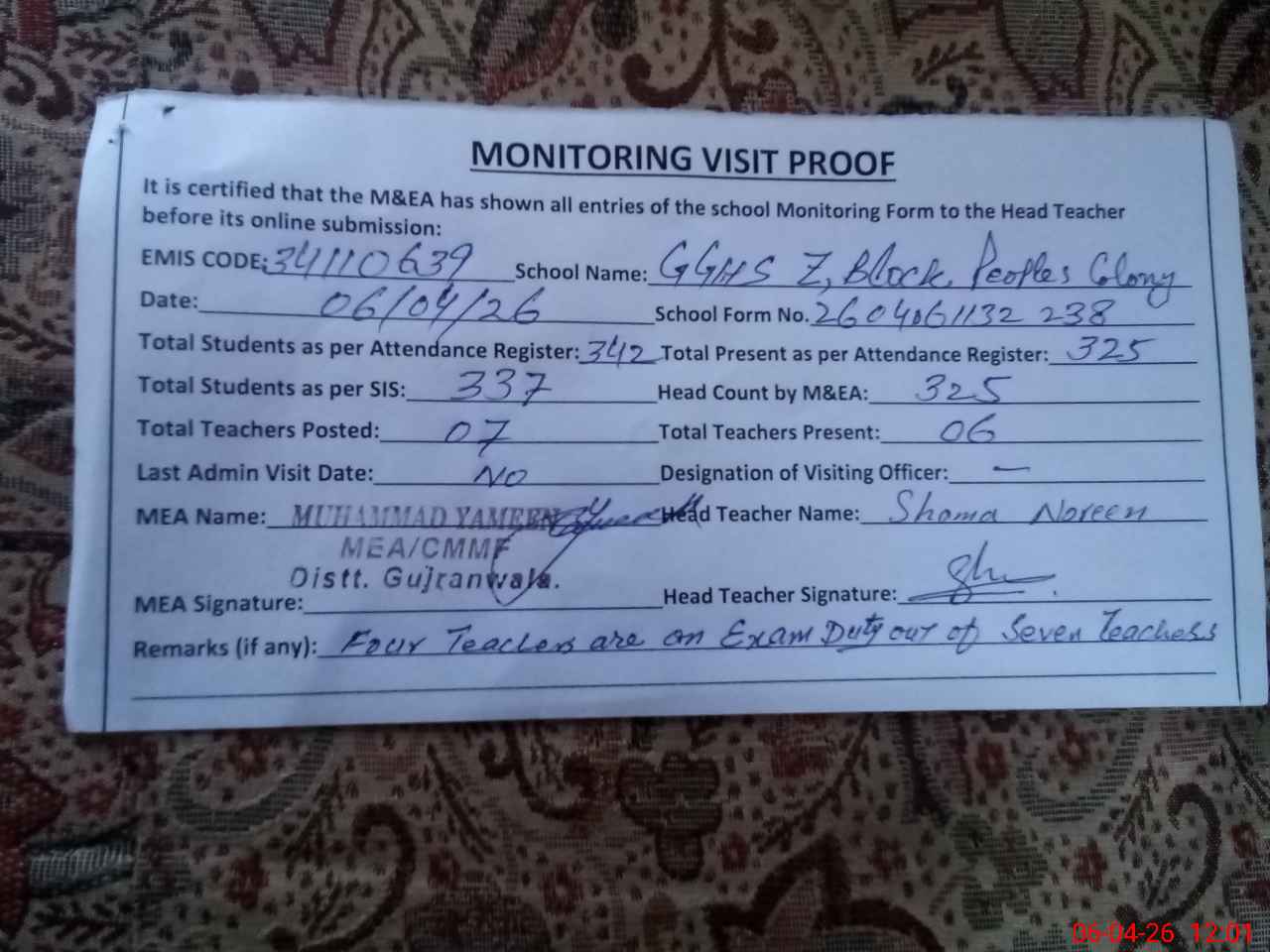 | EMIS Code: 34110639 | Name of School: GGHS Z-Block Peoples Colony | |||