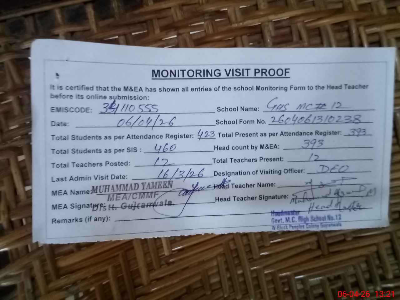 | EMIS Code: 34110555 | Name of School: GHS MC NO.12 PEOPLES COLONY | |||
