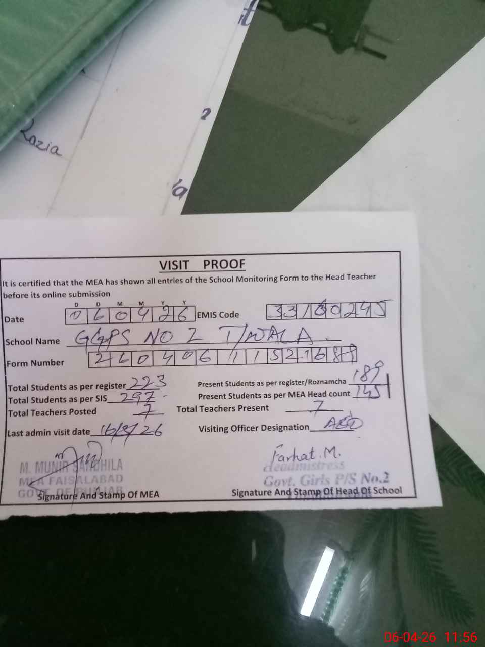 | Attendance Register | Head Teacher | MEA with School | Visit Proof |