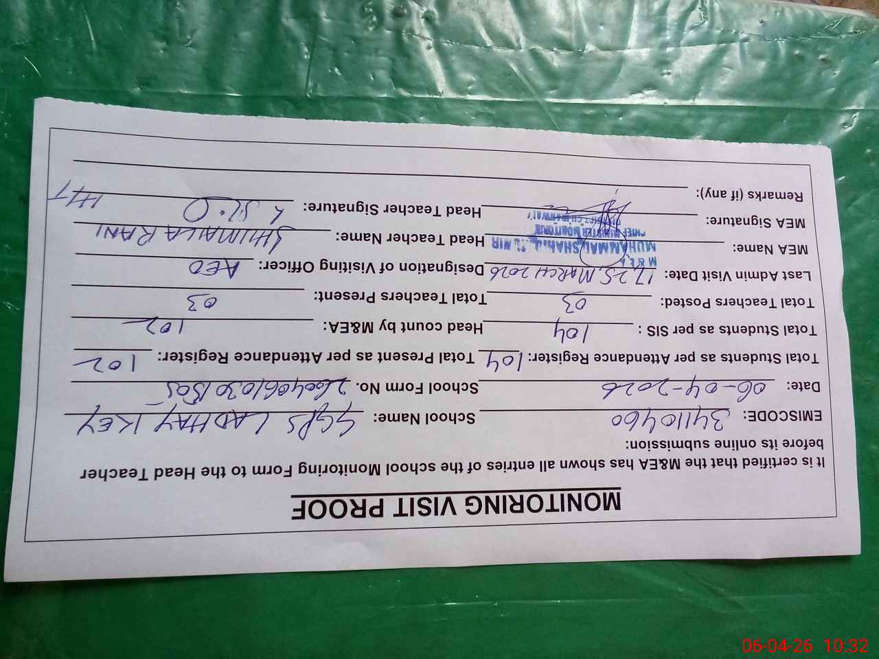 | Attendance Register | Head Teacher | MEA with School | Visit Proof |