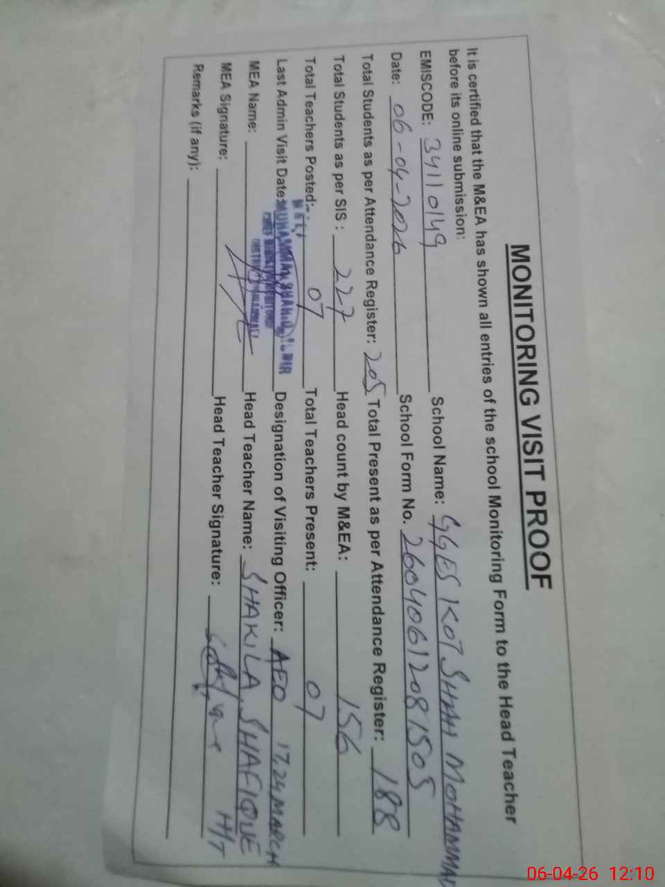 | Certified that this School was Inspected by the Undersigned MEA/DMO Today and the Information Stated Above is as Per Record. | |||||