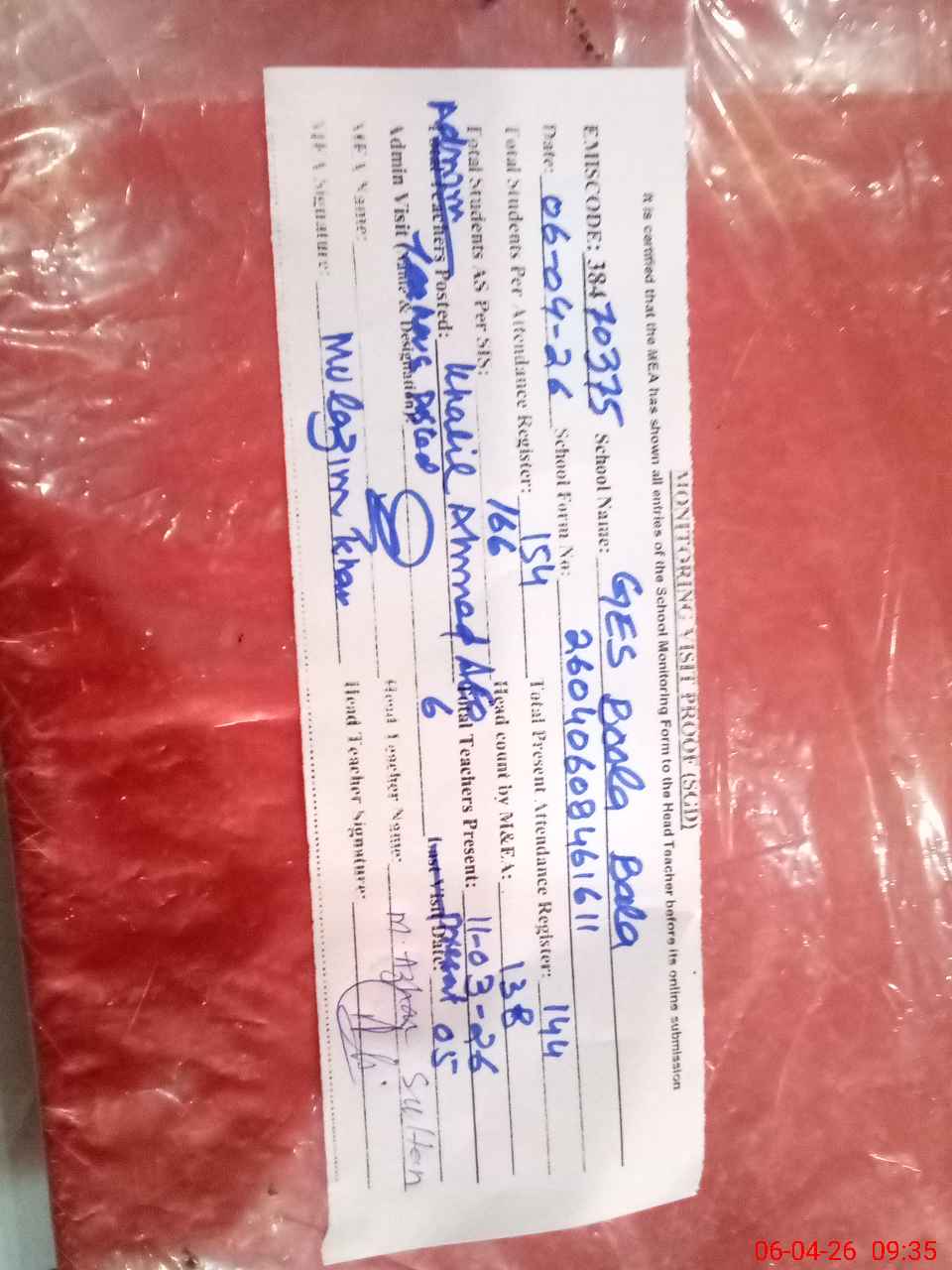 | Attendance Register | Head Teacher | MEA with School | Visit Proof |