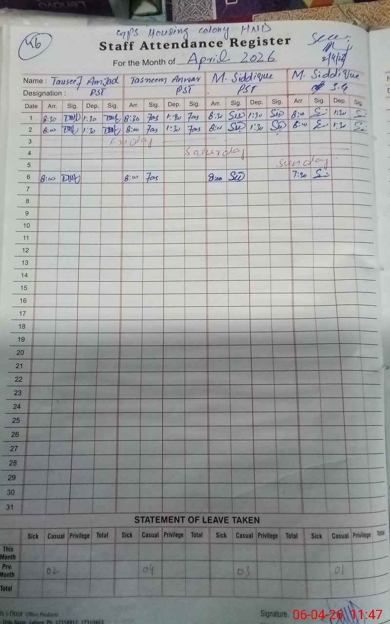 | CNIC | Full Name | Designation | R/C | Absence During Last Calender Month |