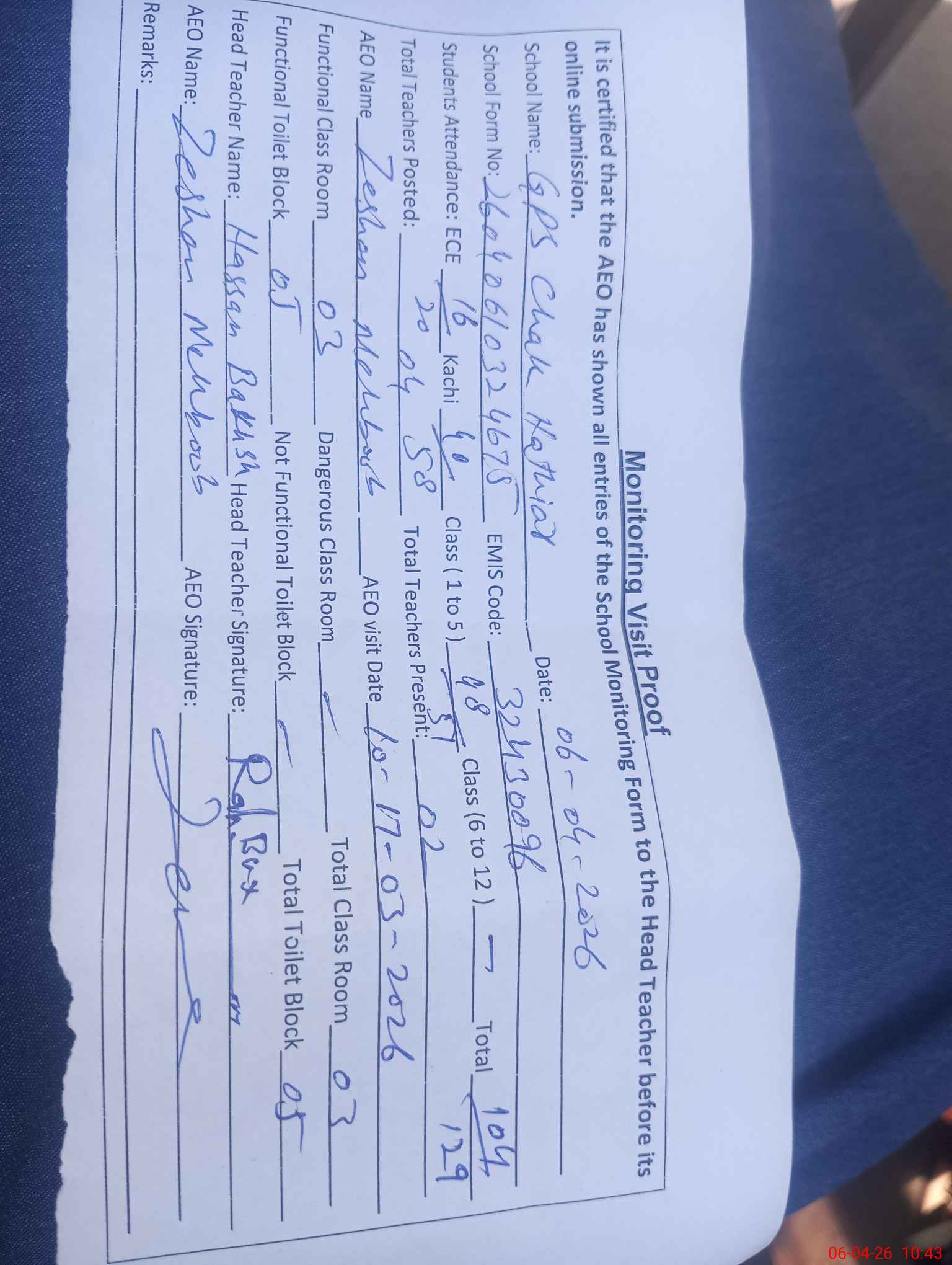 | EMIS Code: 32430096 | Name of School: GPS CHAK HATHIAR | |||