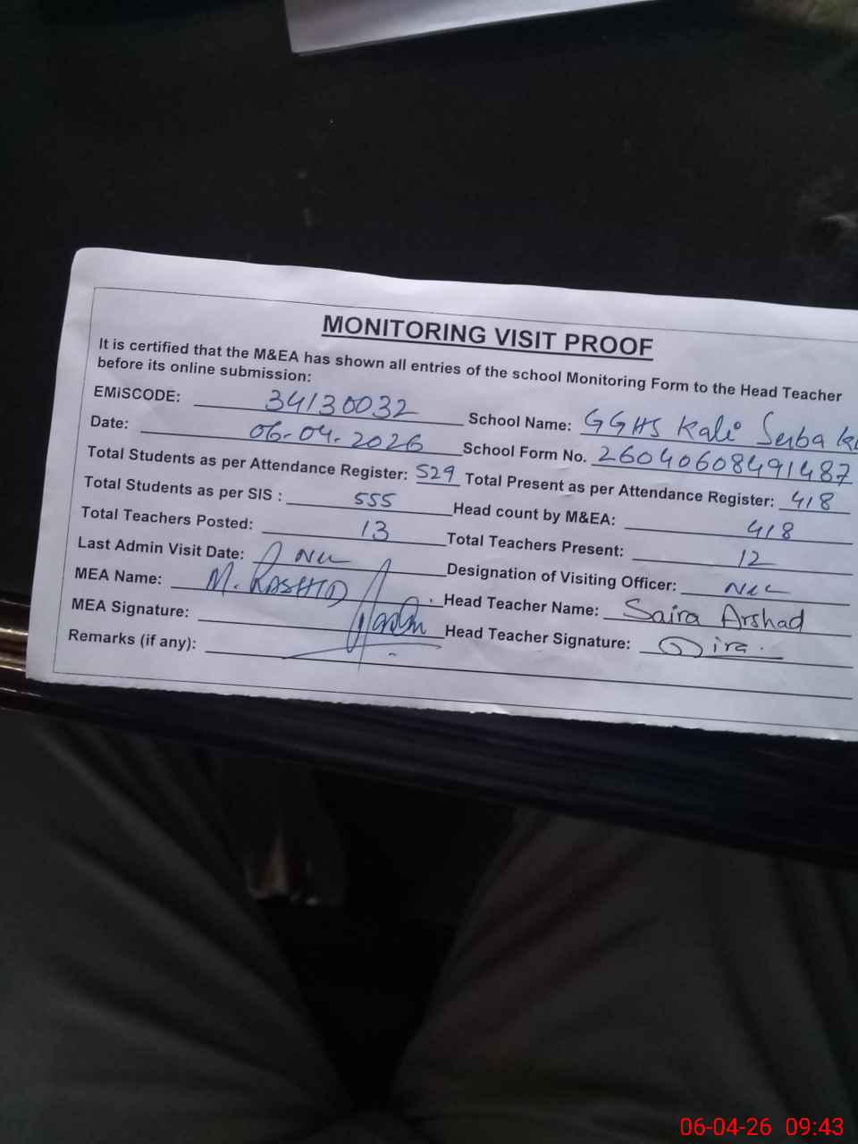 | Attendance Register | Head Teacher | MEA with School | Visit Proof |