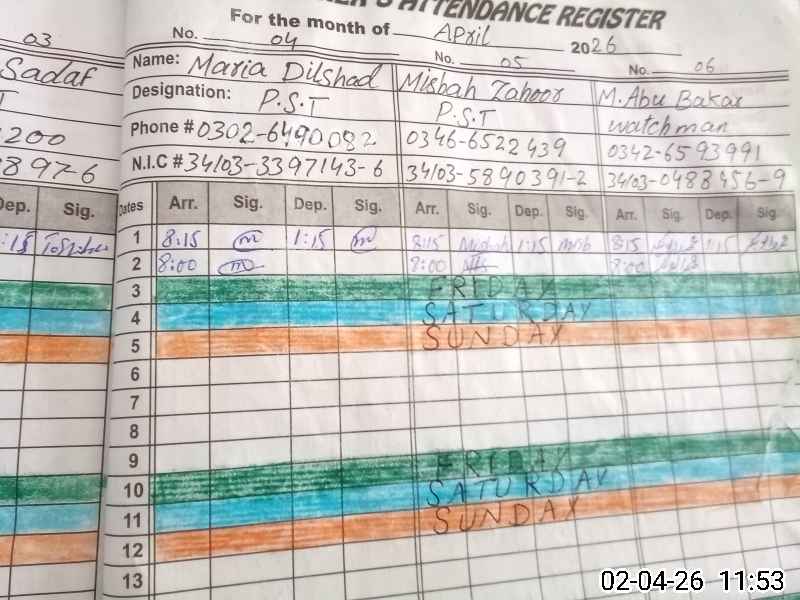 | CNIC | Full Name | Designation | R/C | Absence During Last Calender Month |
