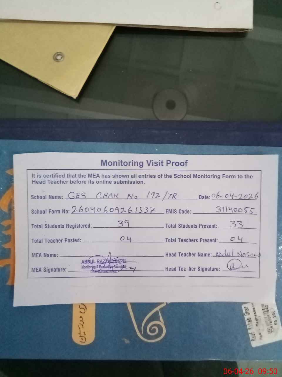 | EMIS Code: 31140055 | Name of School: GES CHAK NO. 192/7-R | |||