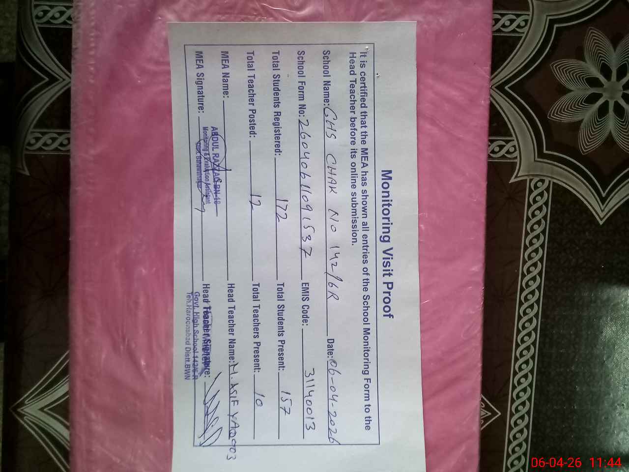 | EMIS Code: 31140013 | Name of School: GHS CHAK NO. 142/6-R | |||