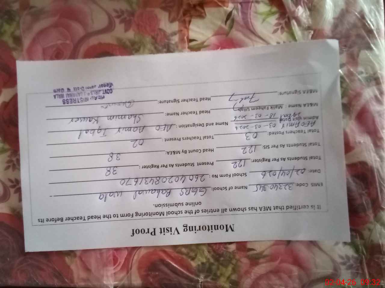| EMIS Code: 32340345 | Name of School: GGPS BAHAWAL WALA | |||