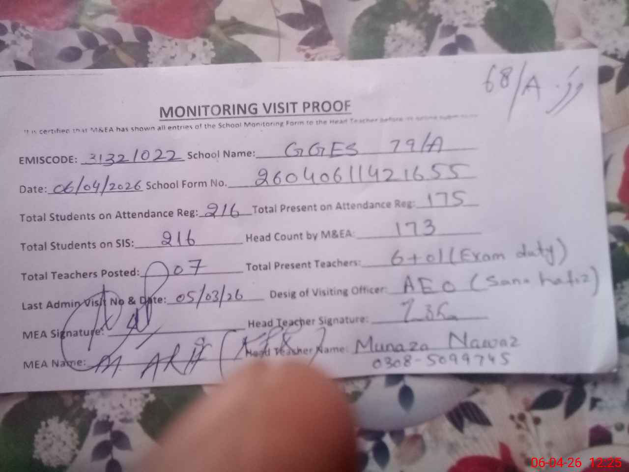 | Name: Mu**** Na**** Designation: (School Headmaster's/Headmistress's) SST Phone/Cell Number: 03**** |