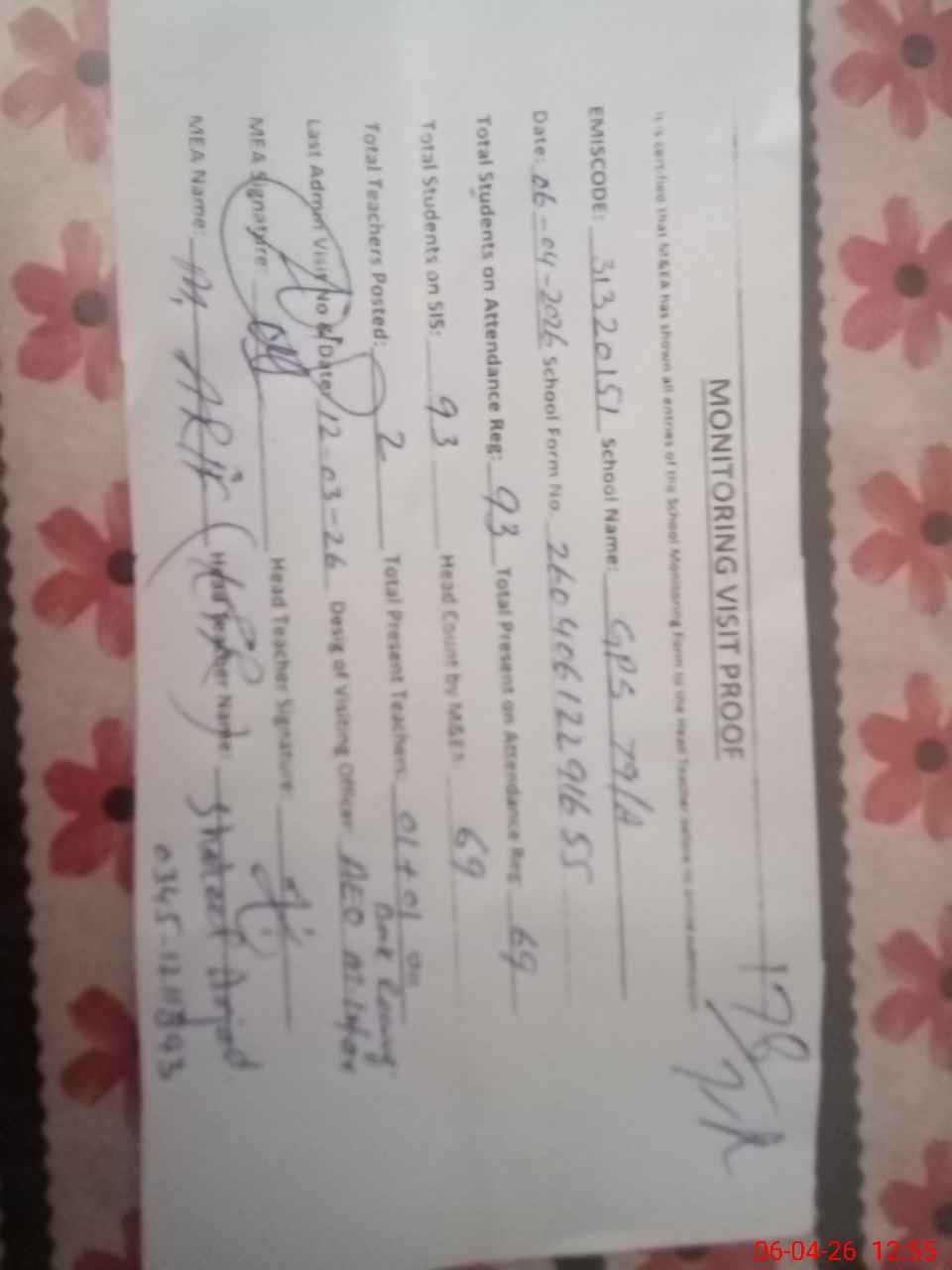 | Attendance Register | Head Teacher | MEA with School | Visit Proof |