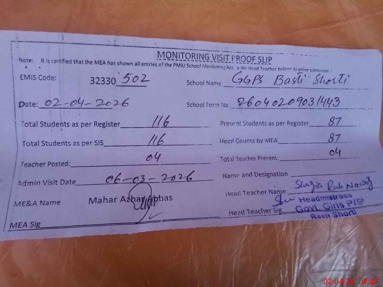 | Attendance Register | Head Teacher | MEA with School | Visit Proof |