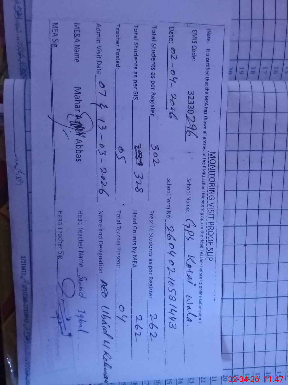 | EMIS Code: 32330296 | Name of School: GPS KORAI WALA | |||