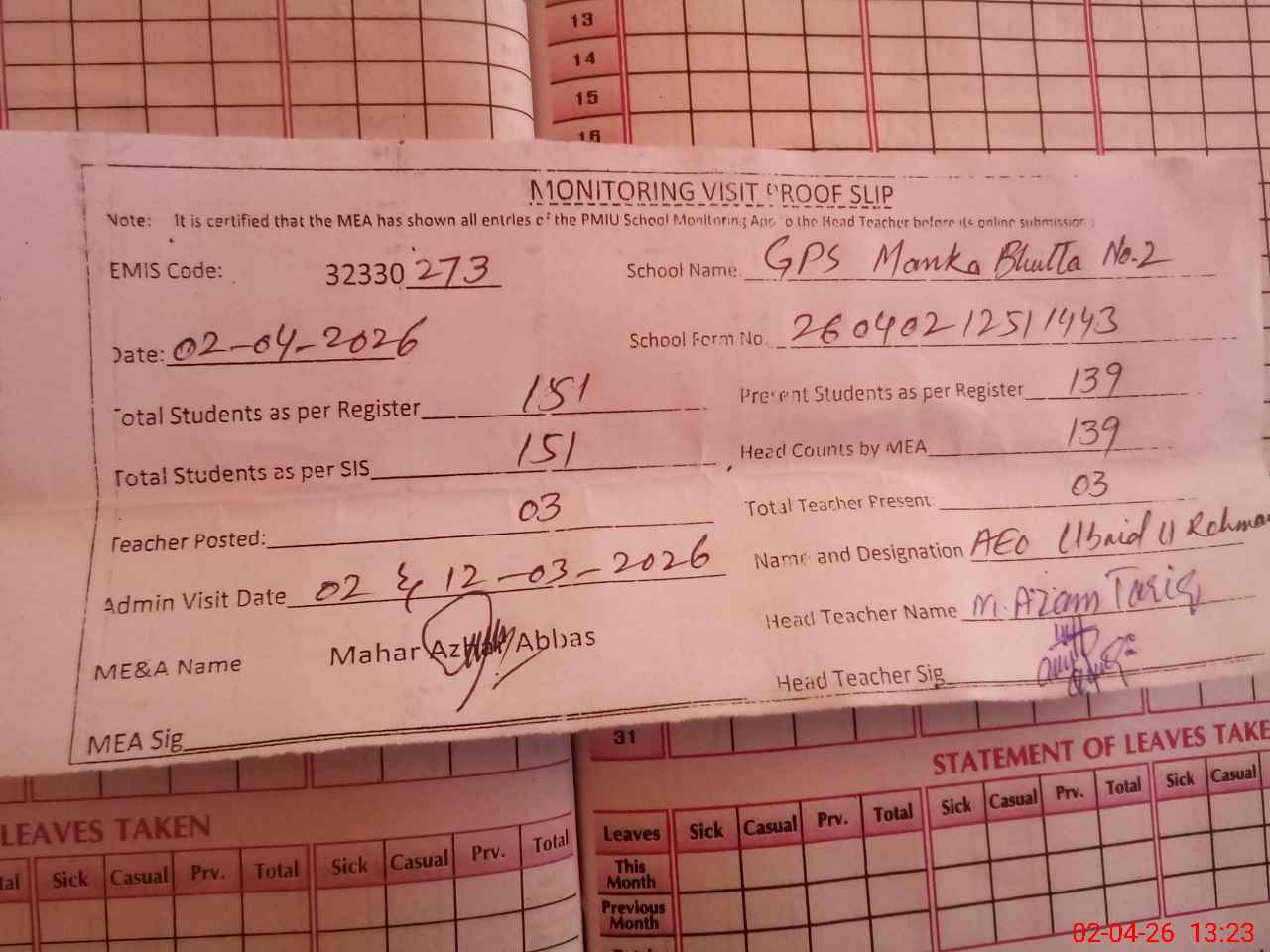 | Attendance Register | Head Teacher | MEA with School | Visit Proof |