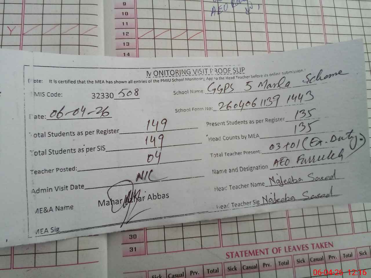 | Attendance Register | Head Teacher | MEA with School | Visit Proof |