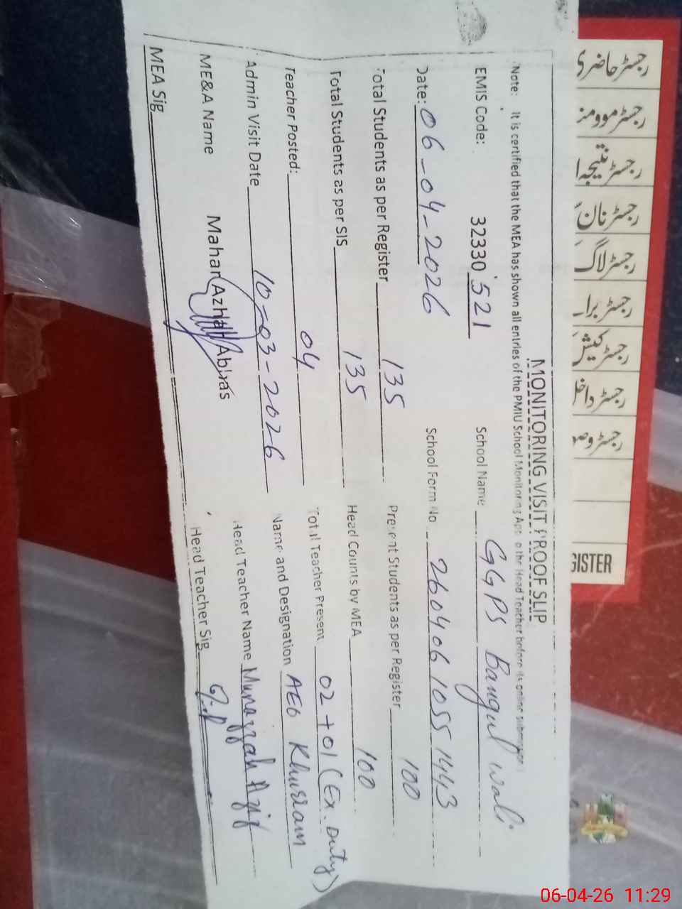 | Attendance Register | Head Teacher | MEA with School | Visit Proof |