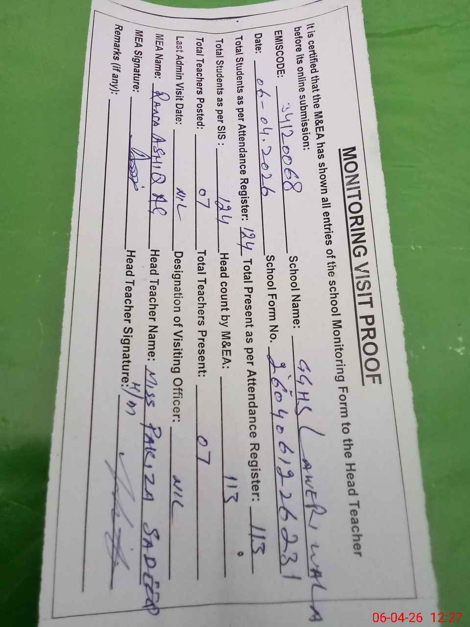 | Attendance Register | Head Teacher | MEA with School | Visit Proof |