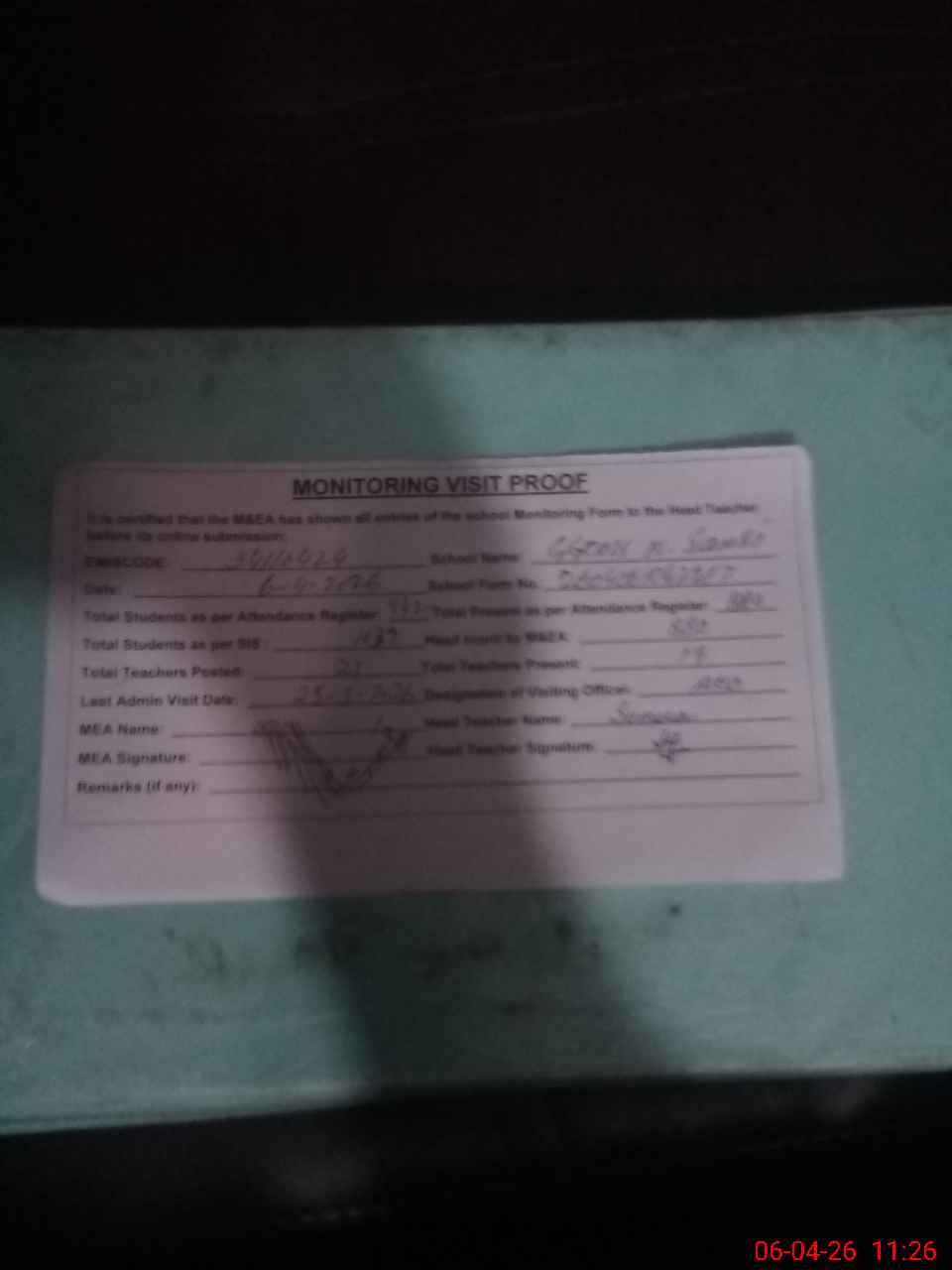 | Attendance Register | Head Teacher | MEA with School | Visit Proof |