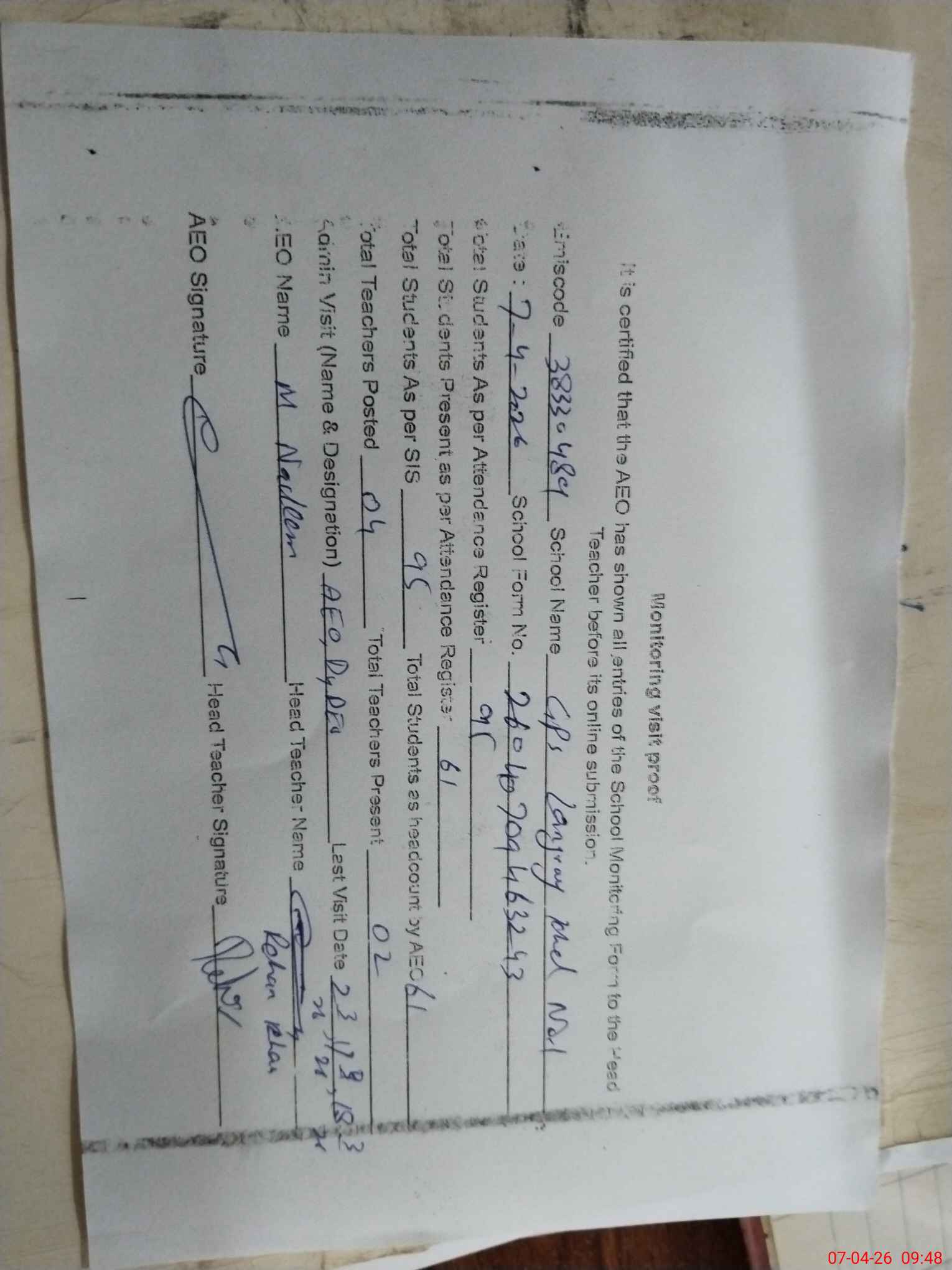 | Attendance Register | Head Teacher | MEA with School | Visit Proof |