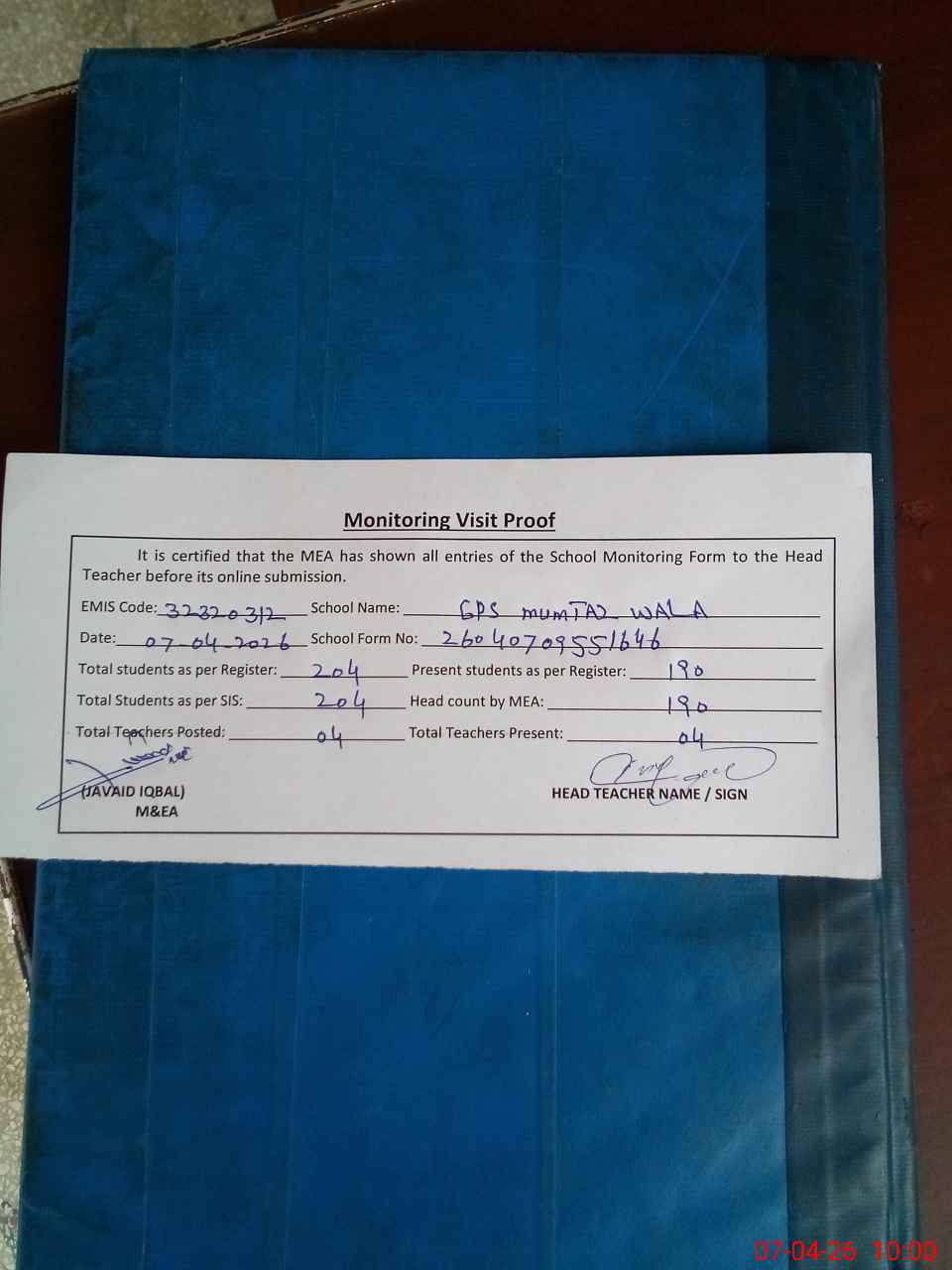 | Attendance Register | Head Teacher | MEA with School | Visit Proof |