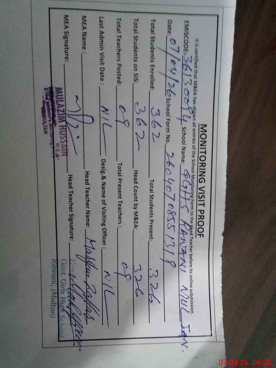 | Certified that this School was Inspected by the Undersigned MEA/DMO Today and the Information Stated Above is as Per Record. | |||||