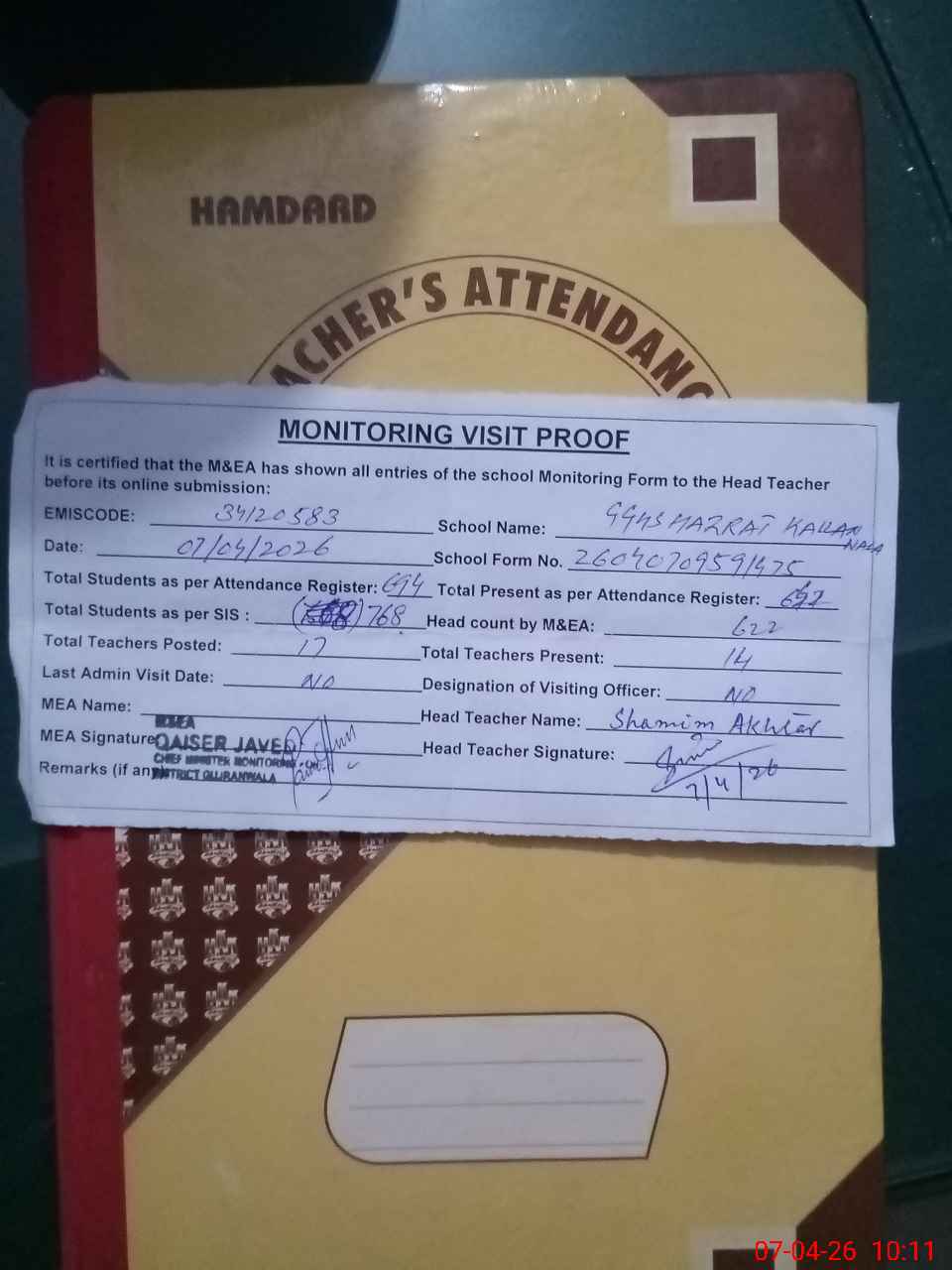 | Attendance Register | Head Teacher | MEA with School | Visit Proof |