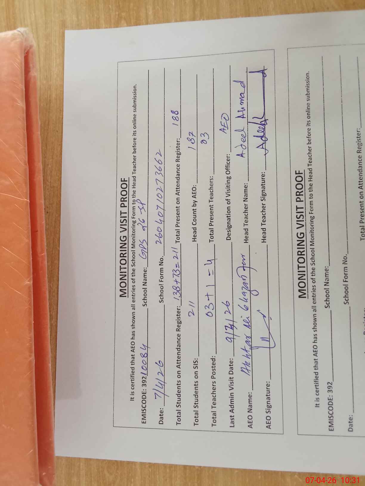 | Attendance Register | Head Teacher | MEA with School | Visit Proof |