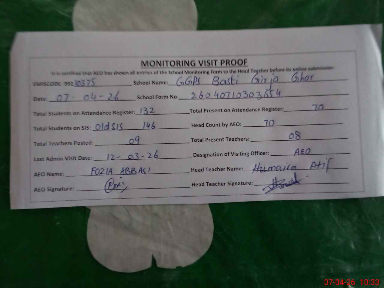 | Attendance Register | Head Teacher | MEA with School | Visit Proof |