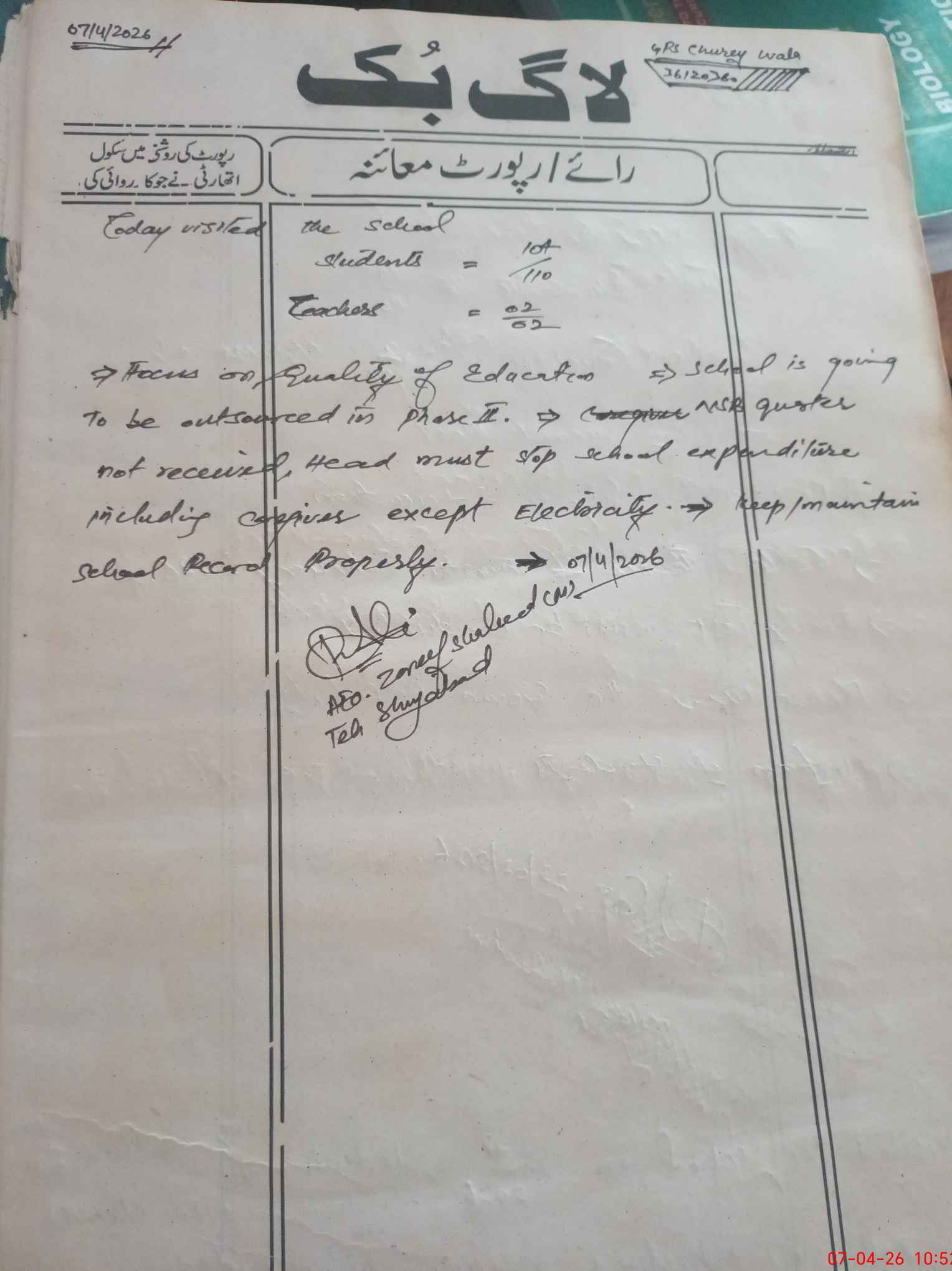 | Certified that this School was Inspected by the Undersigned MEA/DMO Today and the Information Stated Above is as Per Record. | |||||