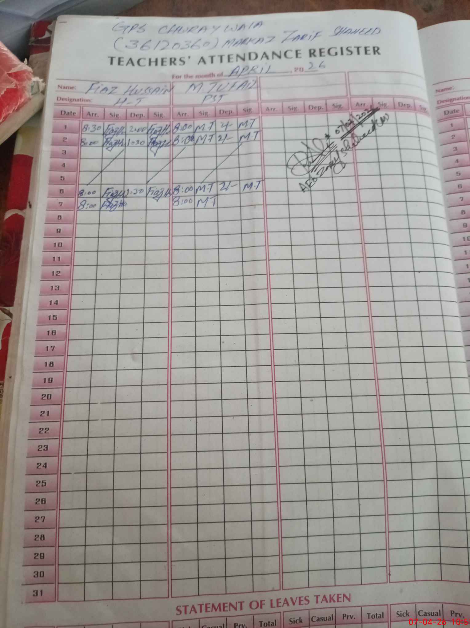 | Name: FI**** HU**** Designation: (School Headmaster's/Headmistress's) PST Phone/Cell Number: 03**** |