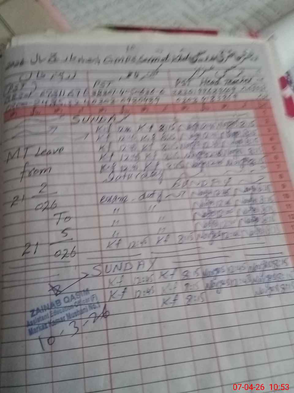 | 38**** | Za**** Kh**** | PST Science/Maths | Regular | 0 | 0 | 0 | 0 | 0 | 0 | 0 | 0 | 0 | Maternity |