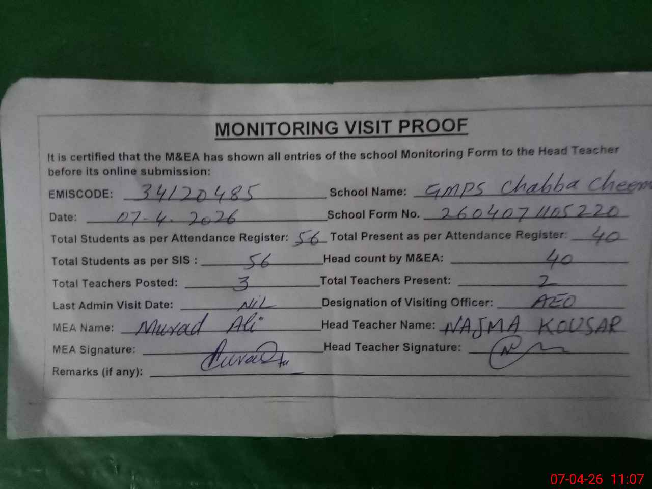 | Attendance Register | Head Teacher | MEA with School | Visit Proof |