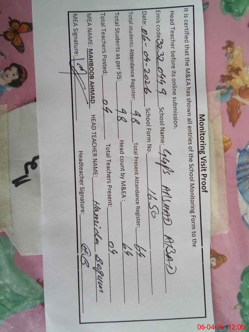 | Attendance Register | Head Teacher | MEA with School | Visit Proof |
