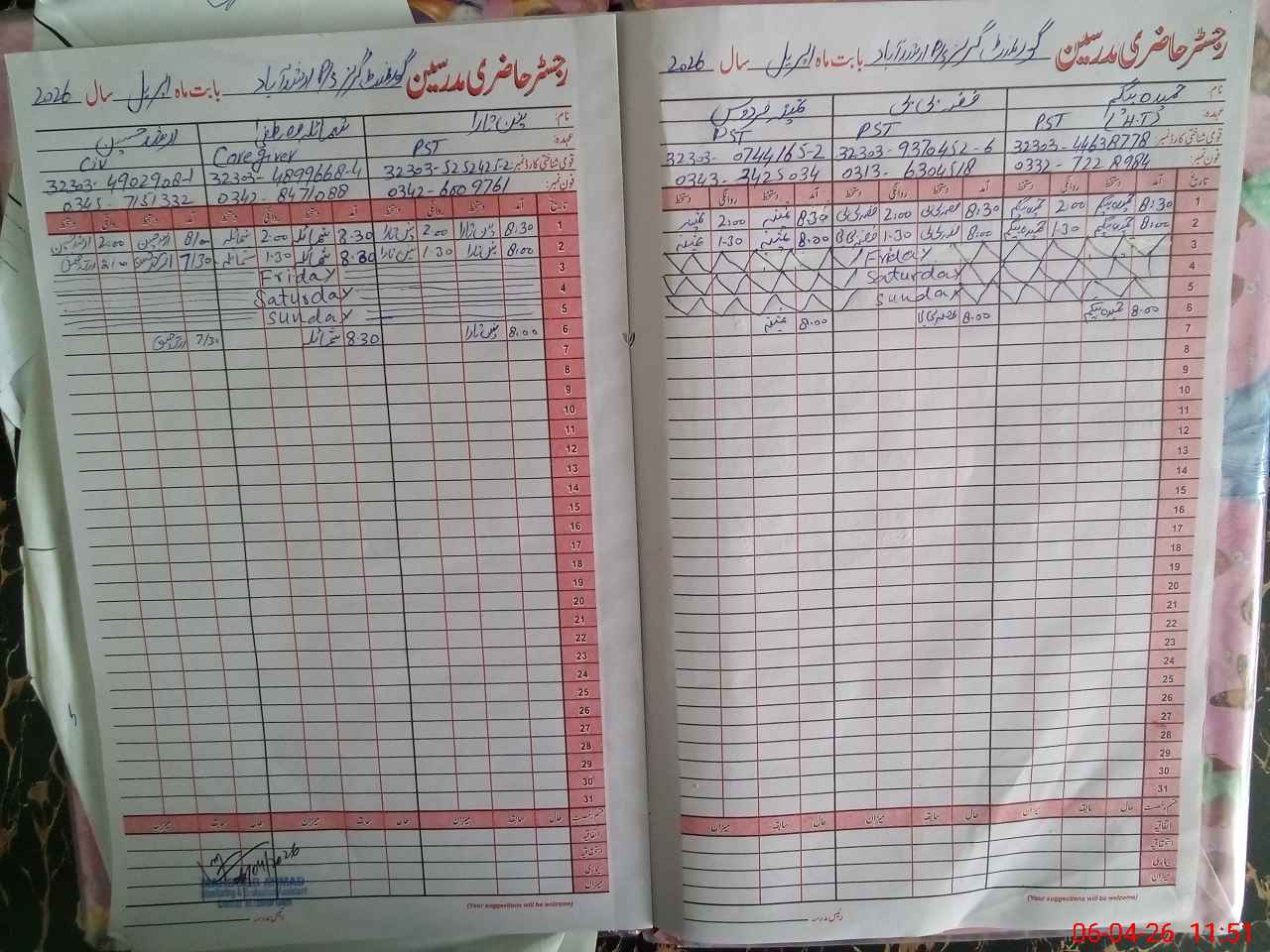 | CNIC | Full Name | Designation | R/C | Absence During Last Calender Month |