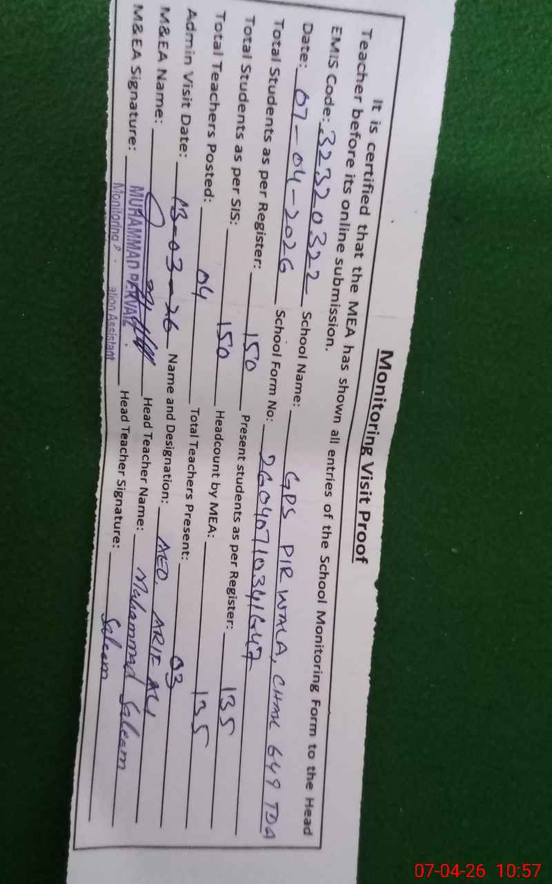 | EMIS Code: 32320322 | Name of School: GPS PIR WALA (CHAK NO. 649/TDA) | |||