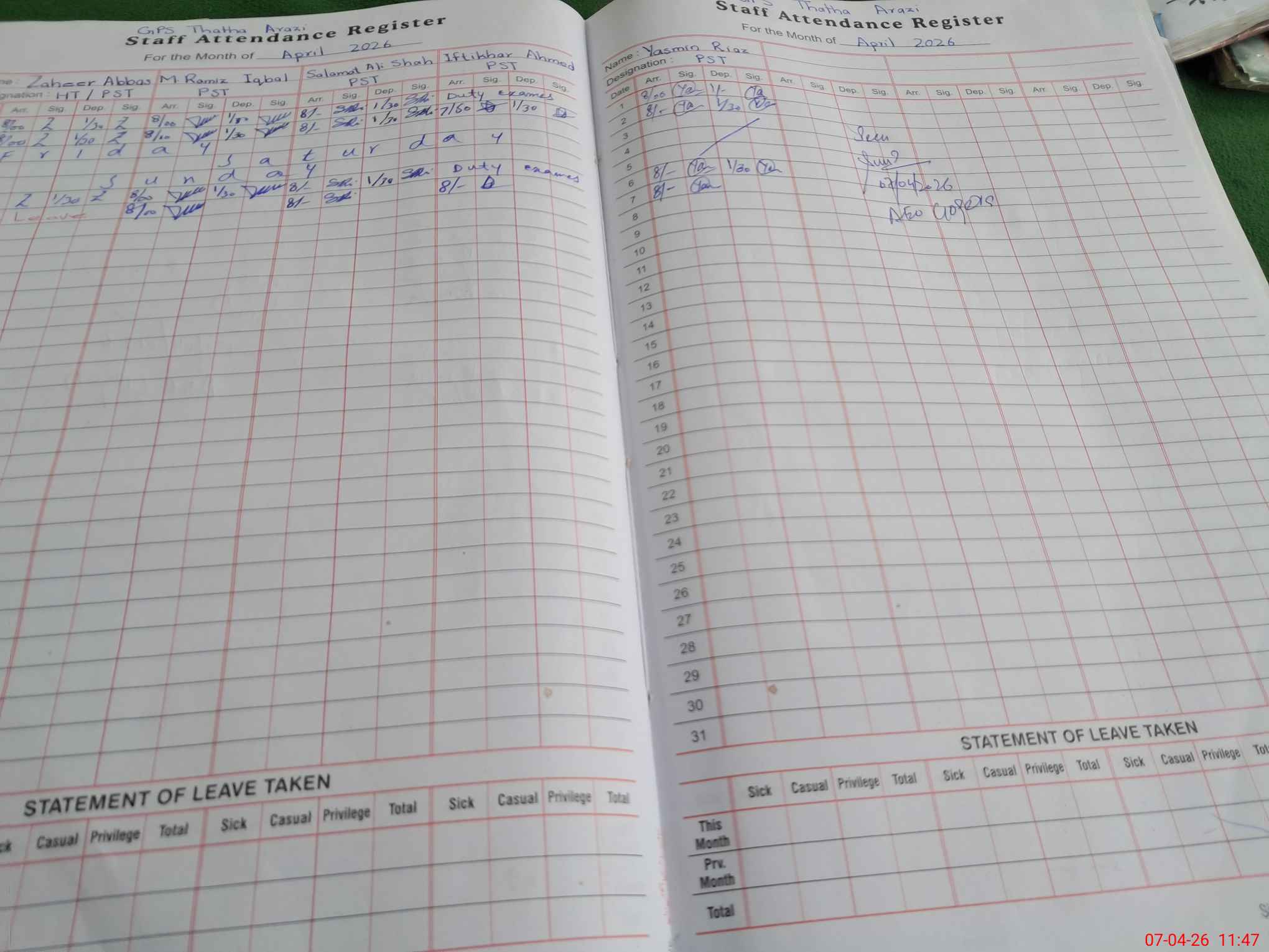 | Leave | Duty | Absent | Maternity | Medical | Ex- Pak |