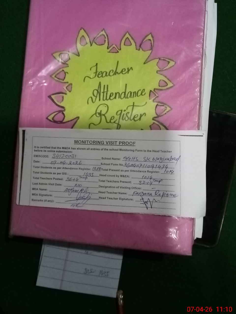 | Attendance Register | Head Teacher | MEA with School | Visit Proof |