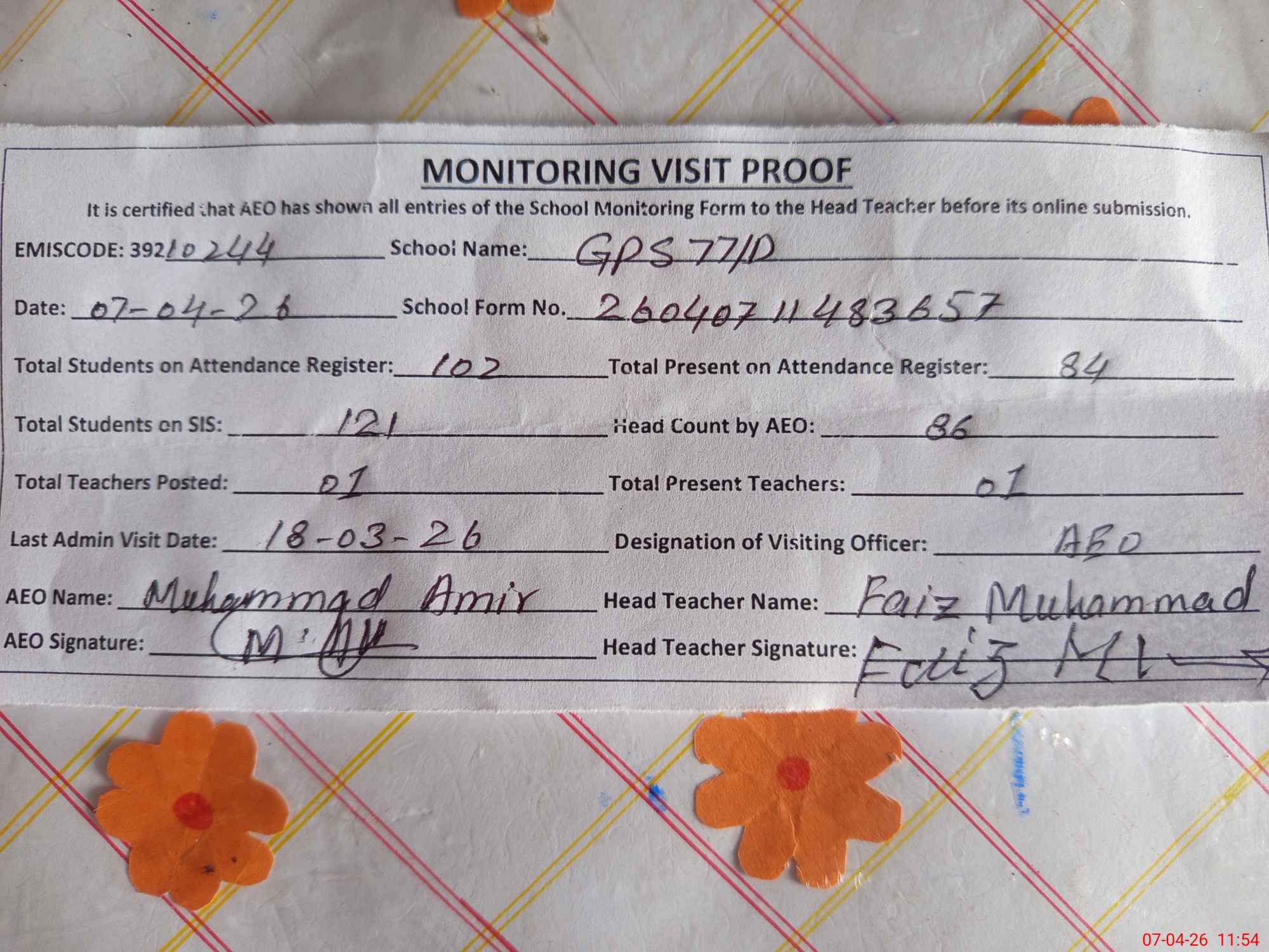 | EMIS Code: 39210244 | Name of School: GPS CHAK NO. 77 /D | |||