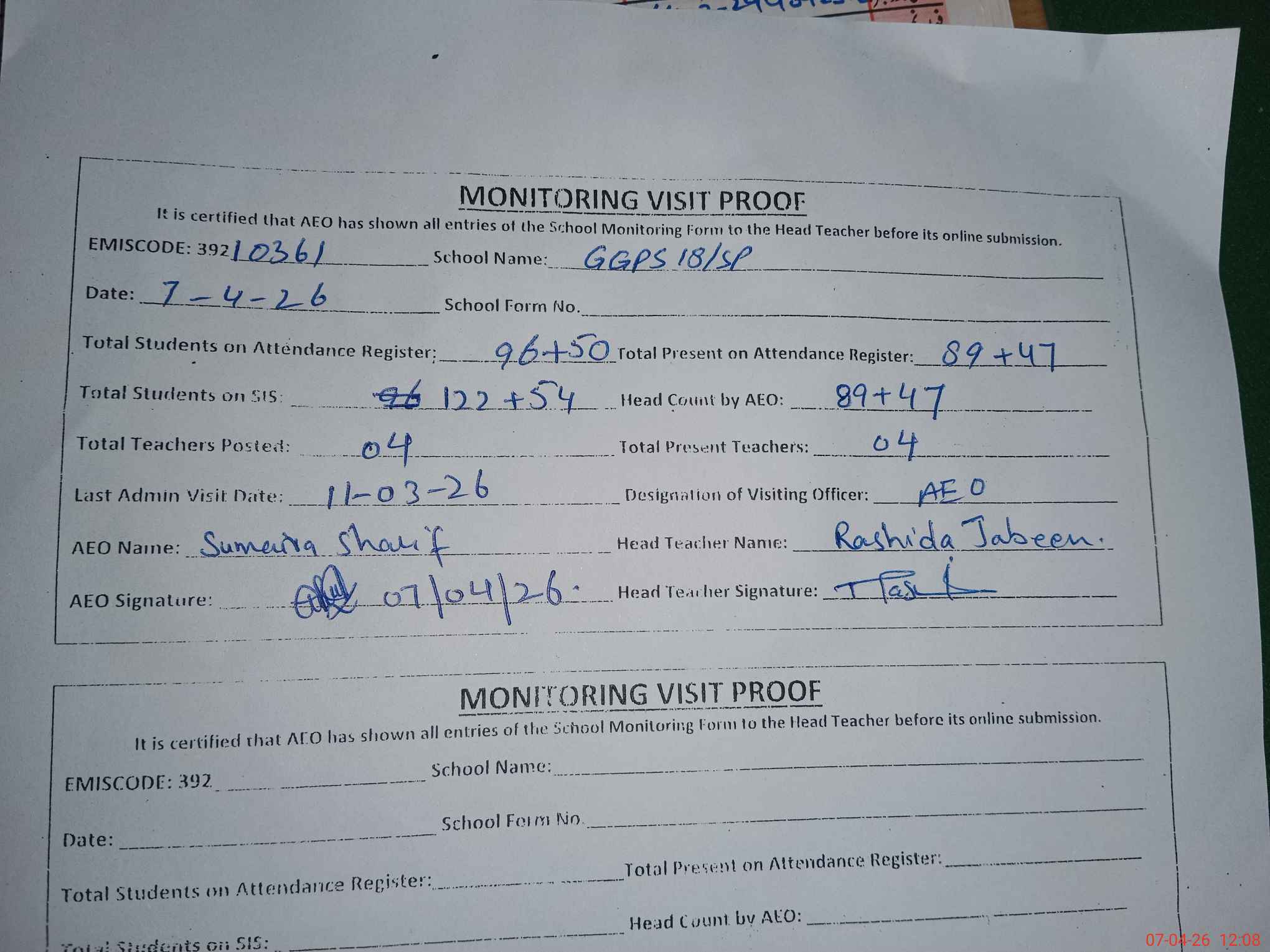 | Attendance Register | Head Teacher | MEA with School | Visit Proof |