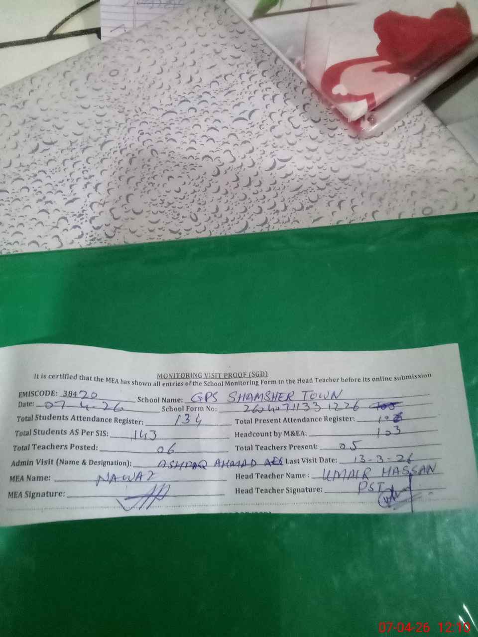 | EMIS Code: 38420797 | Name of School: GPS SHAMSHER TOWN | |||