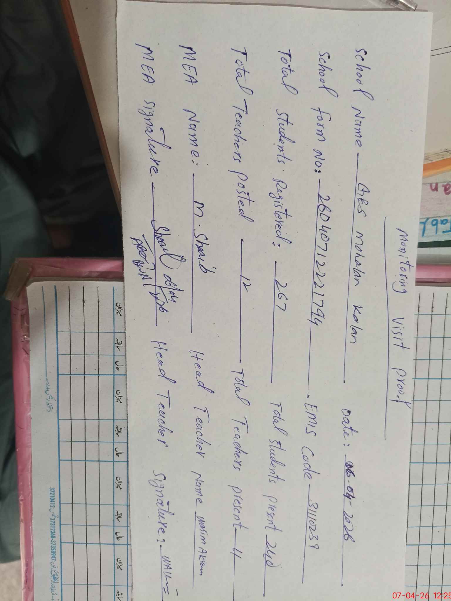 | Attendance Register | Head Teacher | MEA with School | Visit Proof |