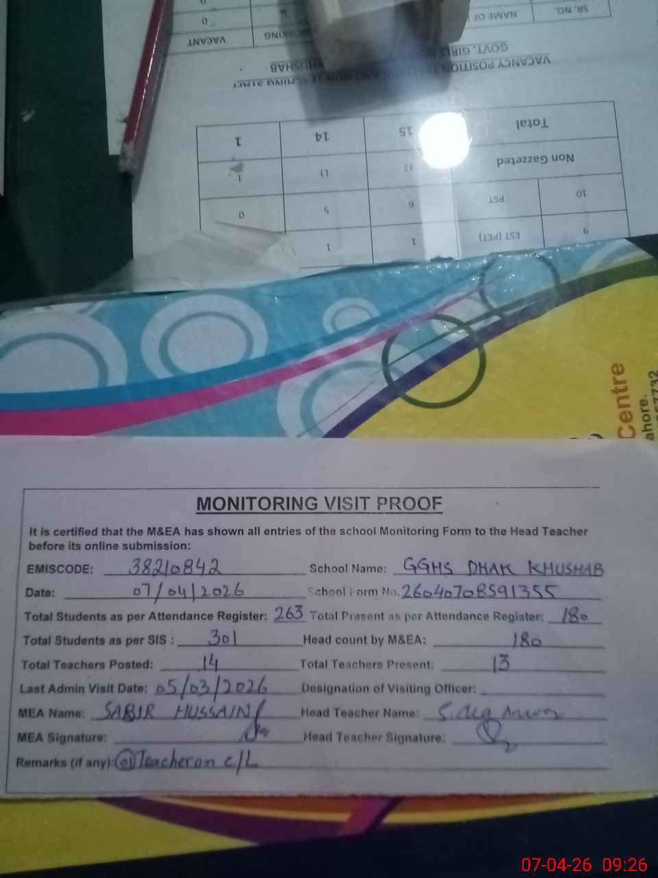| Remarks (Use Separate Page if Required): no teacher absent total students on register 263 total students on SiS 301 difference between register and SiS is because of promotion of classes last admin visit by AEO on 05 Mar 2026 class 8th (29 students) awaiting result not including in total enrollment. | |||||