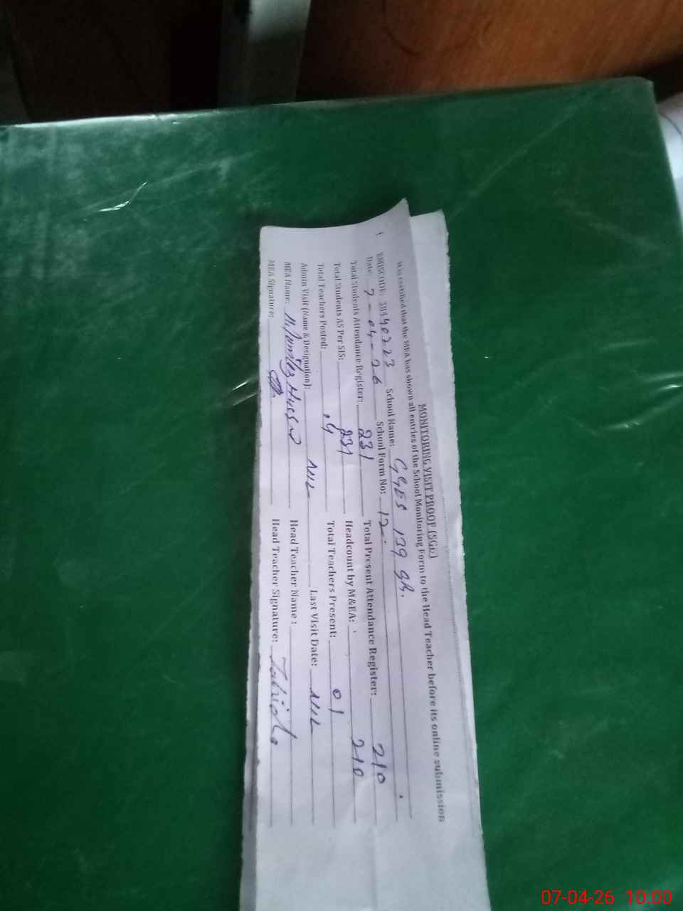 | Attendance Register | Head Teacher | MEA with School | Visit Proof |