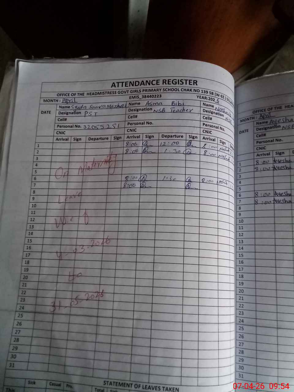 | Leave | Duty | Absent | Maternity | Medical | Ex- Pak |