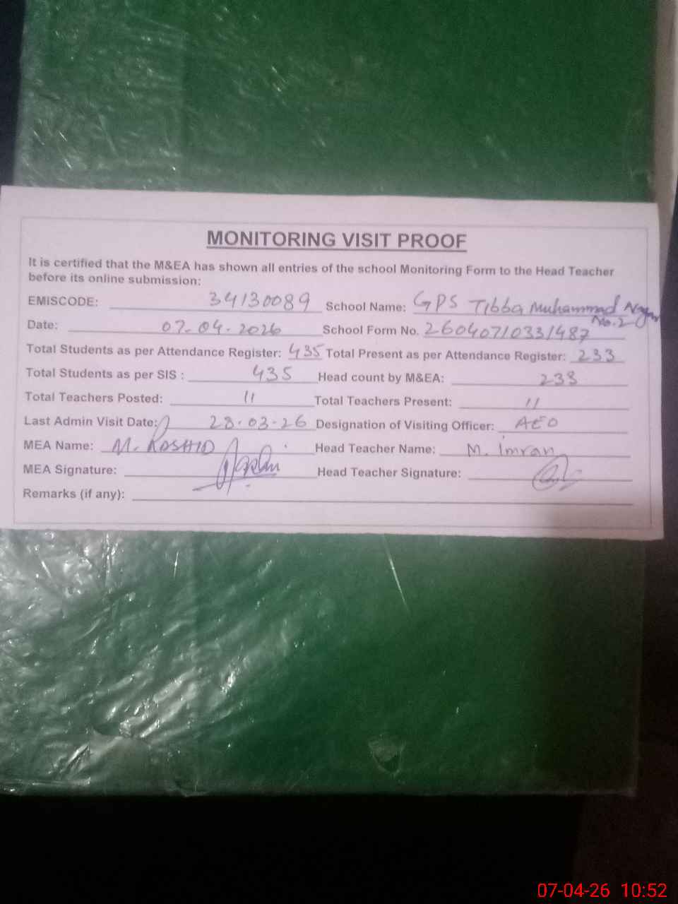 | EMIS Code: 34130089 | Name of School: GPS TIBBA MUHAMMAD NAGAR NO.2 | |||